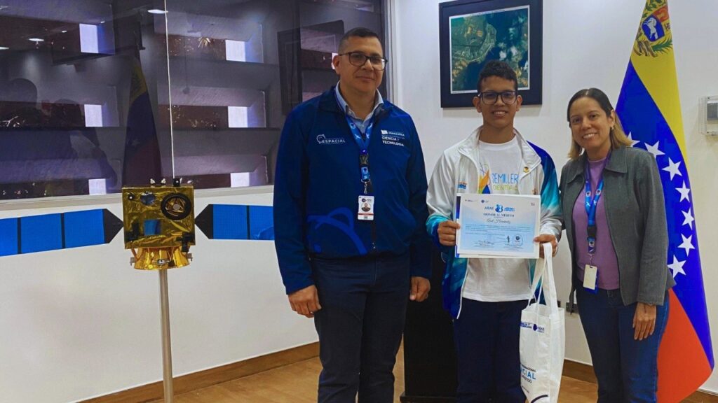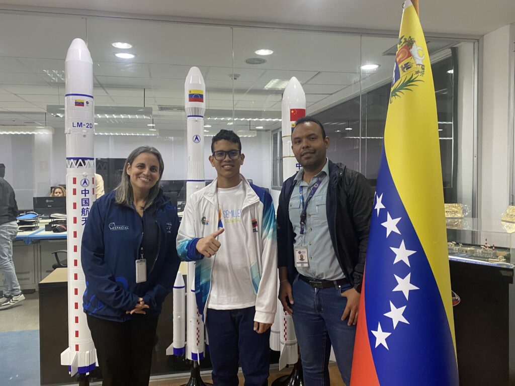 En los espacios del Complejo Tecnológico Simón Rodríguez, ubicado en la Base Aérea Generalísimo Francisco de Miranda, La Carlota, Caracas, el presidente de la ABAE, coronel Adolfo Godoy, y la directora ejecutiva de la institución, María Guarirapa, recibieron a este talentoso estudiante, miembro del Programa Nacional Semilleros Científicos.