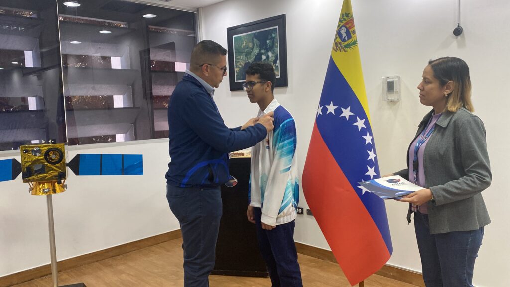 Prensa ABAE. — La Agencia Bolivariana para Actividades Espaciales (ABAE), ente adscrito al Ministerio del Poder Popular para Ciencia y Tecnología (MINCYT), condecoró este viernes 27 de marzo con el Botón al Mérito y un Diploma de Reconocimiento a Axel Hernández, quien recientemente obtuvo la medalla de plata en la Olimpiada Internacional de Matemáticas (IMO) Vietnam 2026.